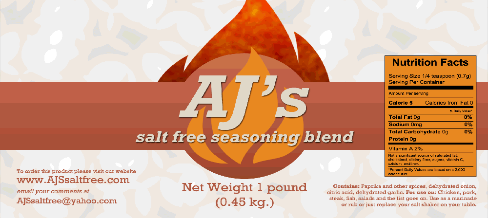 Are you looking for a healthy, go-to seasoning to keep in your kitchen? Something that tastes great on everything, but doesn't leave you with that bloated feeling those salty blends do? Something that you can feel good about eating and feeding your family? Look no further. AJ's is a salt-free seasoning blend that can be used on just about anything. It has a little spice and is extremely versatile. It can be used on chicken, pork, beef, fish and seafood, vegetables, eggs, in or on salads; literally everything. The flavor adapts well to what is being cooked at the time, which keeps it from becoming boring to use in preparation for any and all meals. It can even be used to replace the salt & pepper shakers on the table! Feel free to ask any questions and thank you for stopping by. |